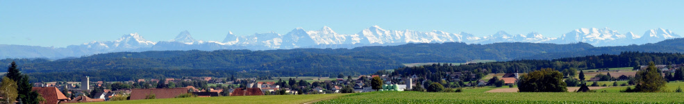 Blick auf das Dorf Fraubrunnen mit Sicht auf die Berner Hochalpen...