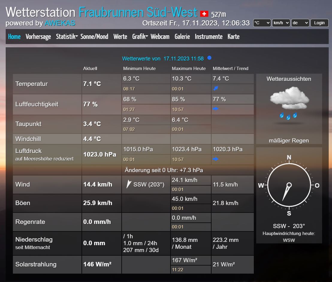 Es freut mich dass sie meine Wetterseiten besuchen. Seit dem 15. November 2023 ist zusätzlich die neue Wetterstation "Davis Vantage Pro2 plus" aufgeschaltet... Rückmeldungen würden mich freuen.