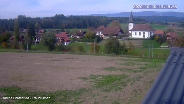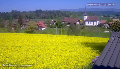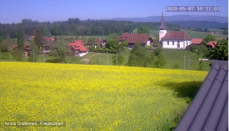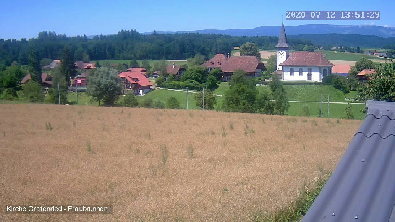 Blick auf das Dorf Fraubrunnen mit Sicht auf die Berner Hochalpen...
